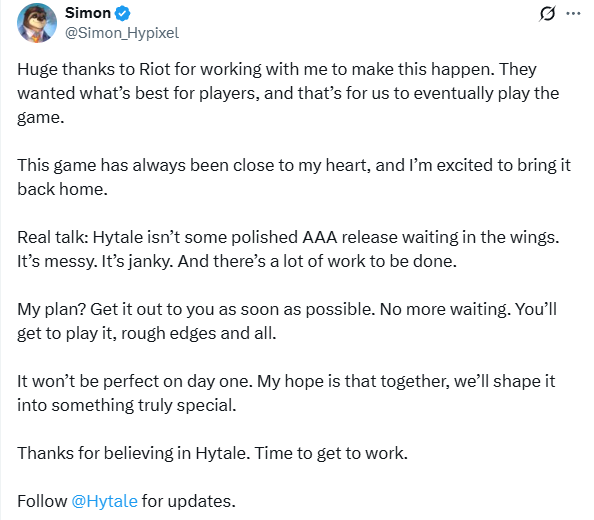X hesabından yaptığı paylaşımlarda görüşmelerin başarılı geçtiğini ve Hytale projesini satın aldığını duyurdu.