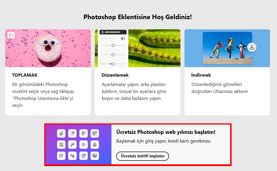 Uzantı ikonuna tıklayın; sizi Photoshop Web sayfasına ya da Adobe hesabıyla giriş ekranına yönlendirecektir.